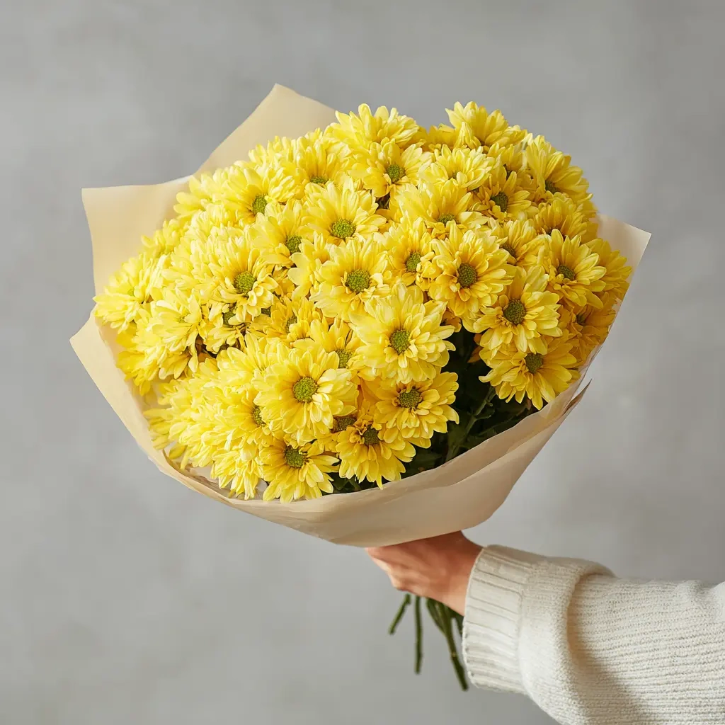 Яркий и солнечный букет, наполненный жизнерадостной энергией. Кустовые хризантемы образуют пышную и живую форму — отличное решение для доброго утреннего подарка или поздравления друга.