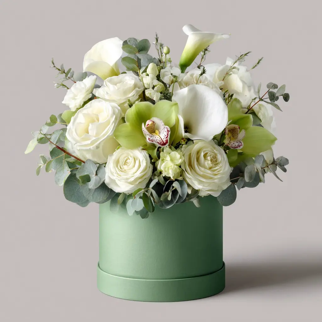 Зеленые орхидеи, каллы и эвкалипт — элегантная композиция для ценителей красоты и изящества.