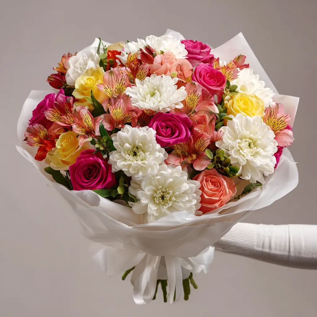 Эффектный букет, в котором альстромерии раскрываются во всей палитре. Яркие, насыщенные краски привлекают внимание и создают праздничную атмосферу. Идеален для запоминающегося сюрприза.