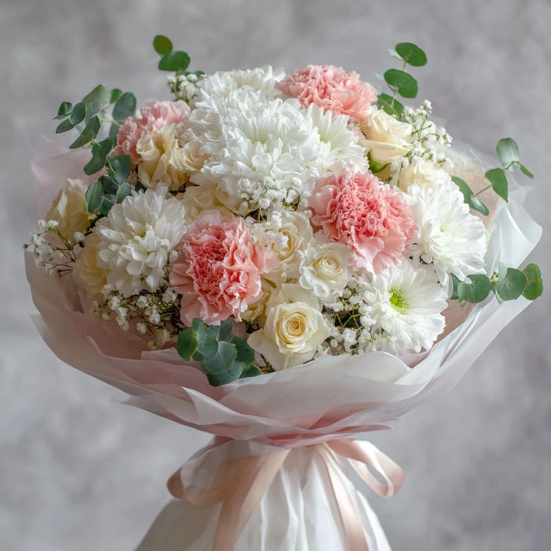 Нежно-розовые гвоздики с веточками эвкалипта — свежий и лёгкий букет, как утренний вдох.
