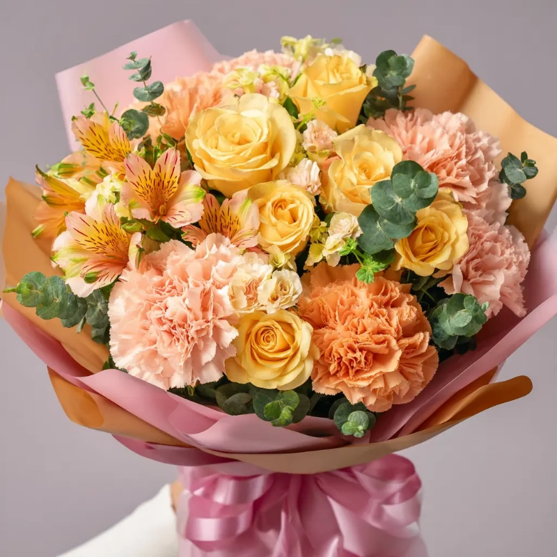 Тёплая гамма жёлтых, персиковых и коралловых оттенков. Напоминает самые красивые моменты летнего заката.