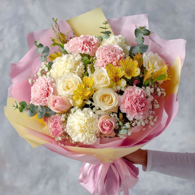 Яркий и тёплый букет, наполненный солнечными оттенками, создаёт атмосферу радости. Идеальный выбор для подарка, который запомнится.