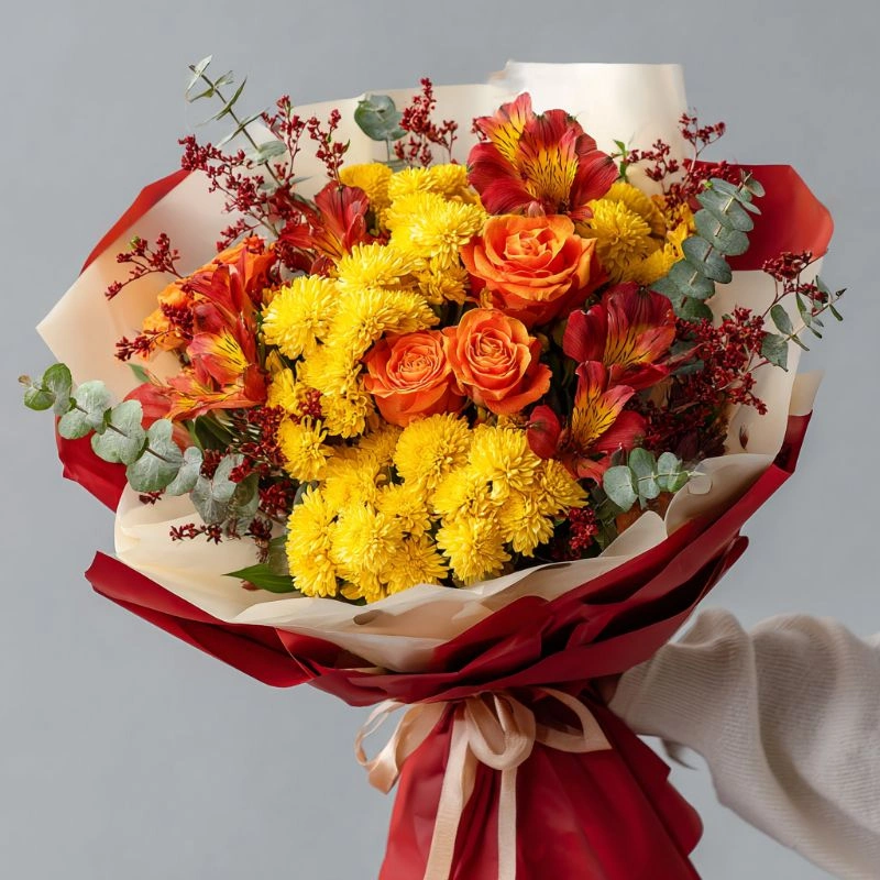 Уютный, трогательный букет в пастельных тонах. Хризантемы создают ощущение тепла и поддержки. Подойдёт для тех, кому хочется сказать «я рядом» или просто напомнить о себе с добротой.