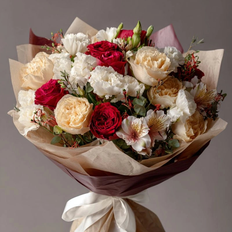 Изысканная композиция на грани сдержанности и утончённости. Эустомы передают хрупкость момента и деликатность жеста. Подходит для подарка тем, кого ценишь и уважаешь.