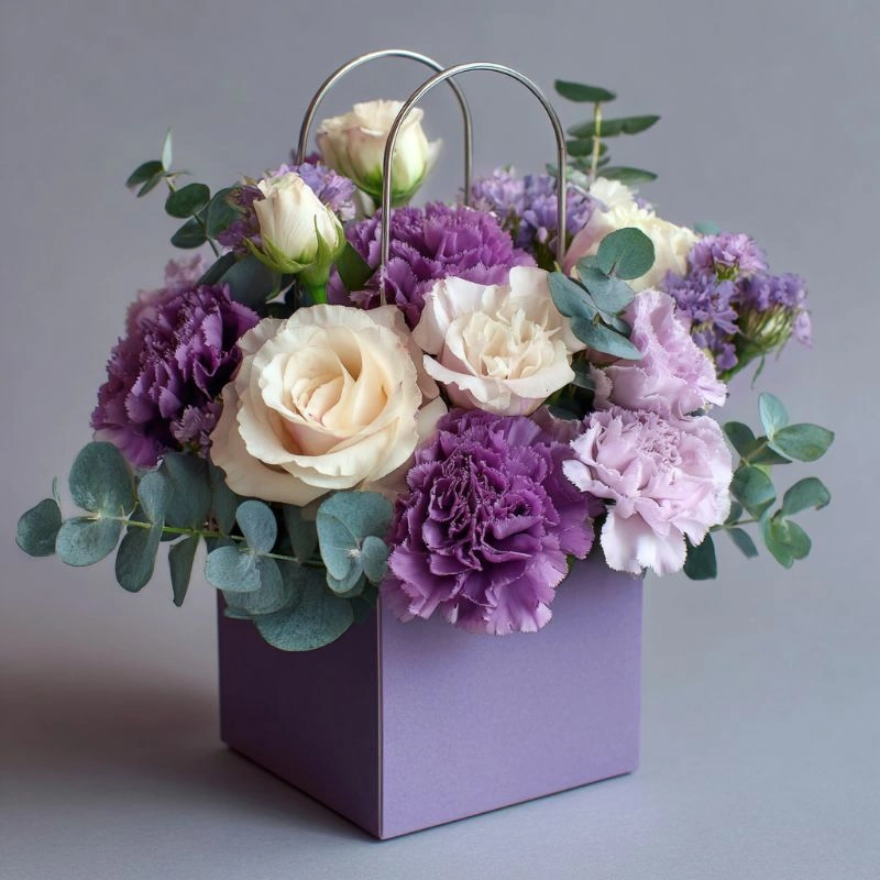 Современный флористический тренд: букет в стильной сумке с яркими нотами цвета и лёгкого аромата. Создан для модниц и тех, кто любит дарить стиль.
