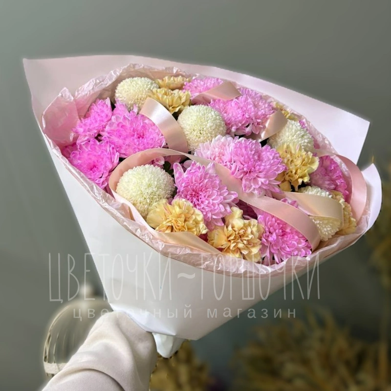 Этот букет, элегантно оформленный в светло-розовую бумагу с атласной лентой, представляет собой нежную композицию из пышных розовых хризантем, персиковых диантусов и необычных белых хризантем . Нежные оттенки цветов создают атмосферу легкости и изящества, идеально подходящую для любого торжества. Букет обязательно порадует и удивит получателя своей красотой.