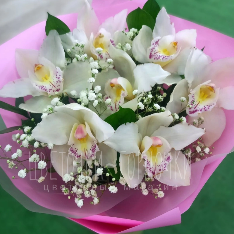 Букет изящных белых орхидей, дополненный нежными веточками гипсофилы и зеленью, привлекает внимание своей элегантностью и изысканностью. Необычные розовые акценты на лепестках орхидей придают композиции дополнительный шарм. Нежный образ букета подчеркивает розовая упаковка, создавая яркий и трогательный образ.