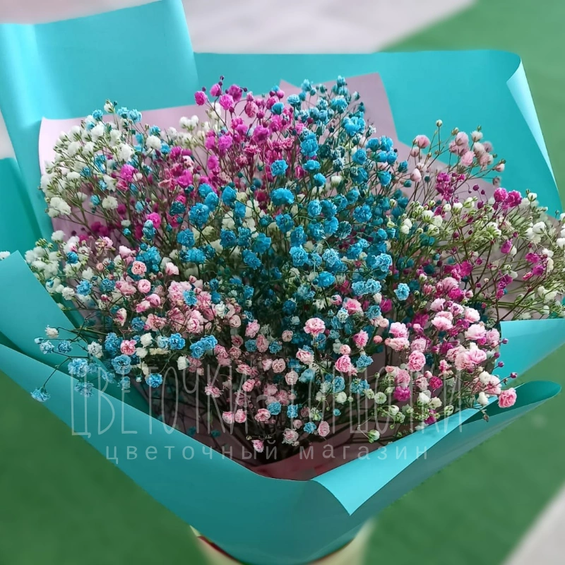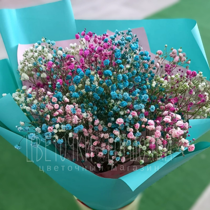 Букет из нежных гипсофил в голубых, розовых и белых оттенках, элегантно завёрнутый в аквамариновую бумагу. Этот воздушный букет создаст праздничное настроение и добавит изящества любому торжеству.