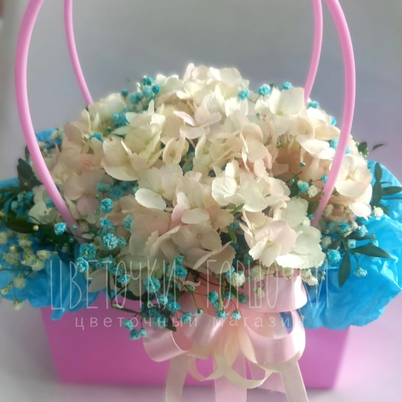 Описание букета Нежная композиция в оригинальной сумочке с изящными ручками прекрасный подарок для любого торжества. Воздушные белые гортензии в сочетании с голубой гипсофилой создают трогательный образ, а атласная лента добавляет композиции элегантности и завершенности.