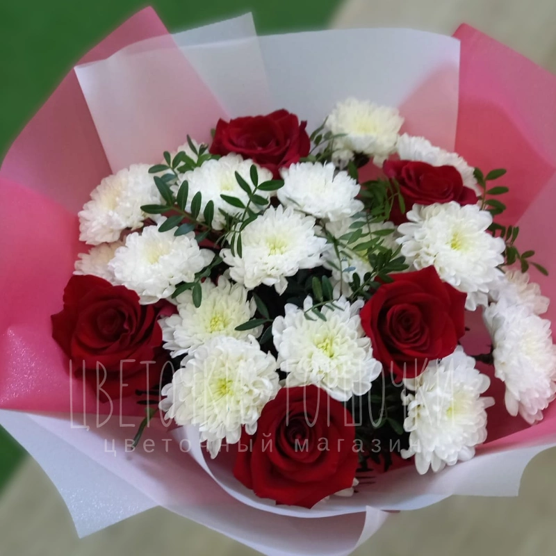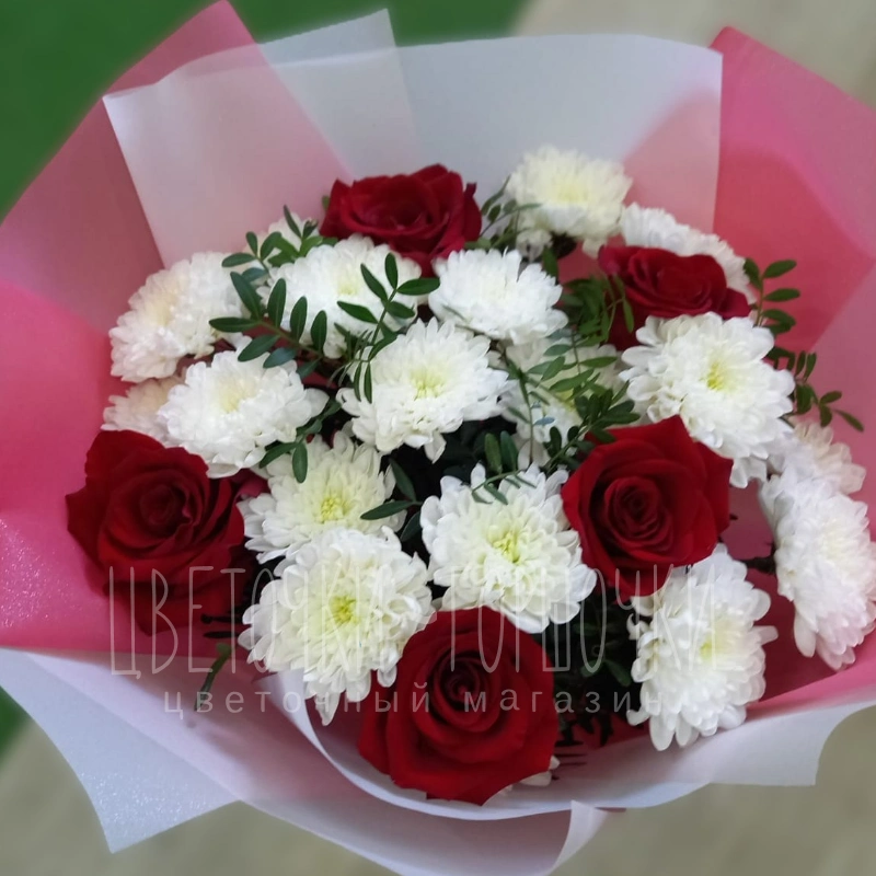 Букет из ярких красных роз и воздушных белых хризантем, элегантно дополненный зеленью. Нежное сочетание оттенков и текстур создает романтичный образ, идеальный для выражения чувств. Прекрасный выбор для любого торжества или просто как знак внимания.