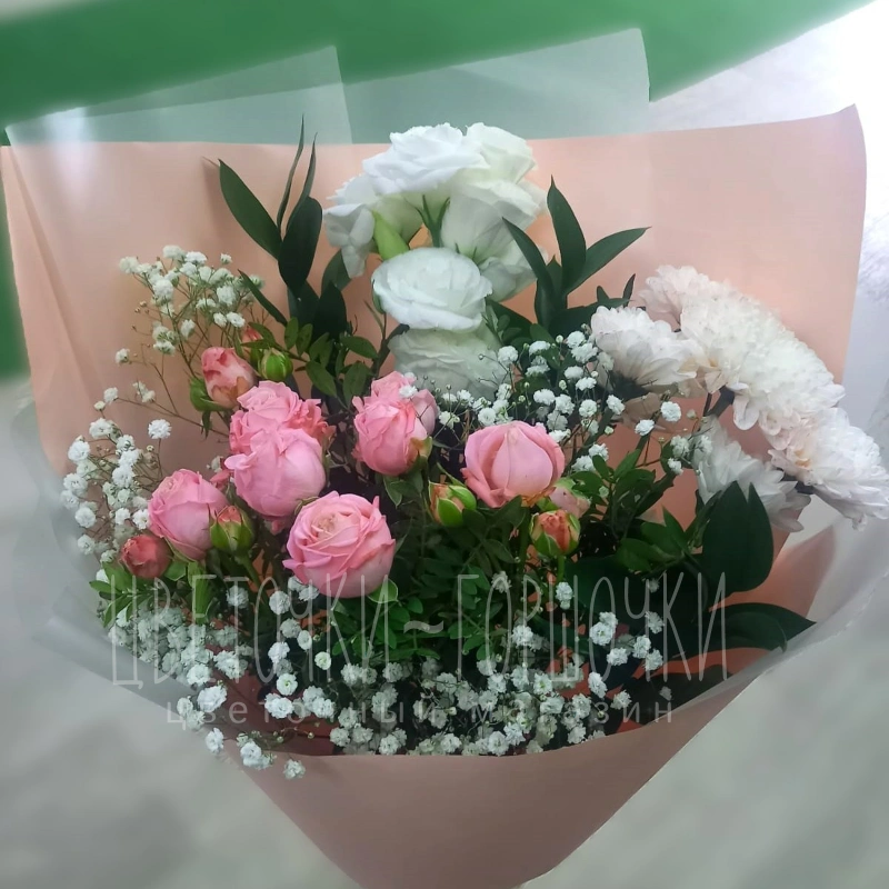 Этот нежный букет, состоящий из розовых роз и белой хризантемы и эустомы, дополненный изящной гипсофилой, станет прекрасным подарком для самых дорогих людей. Необычная цветовая гамма и воздушная структура букета делают его особенно привлекательным. Букет обязательно порадует и удивит получателя!