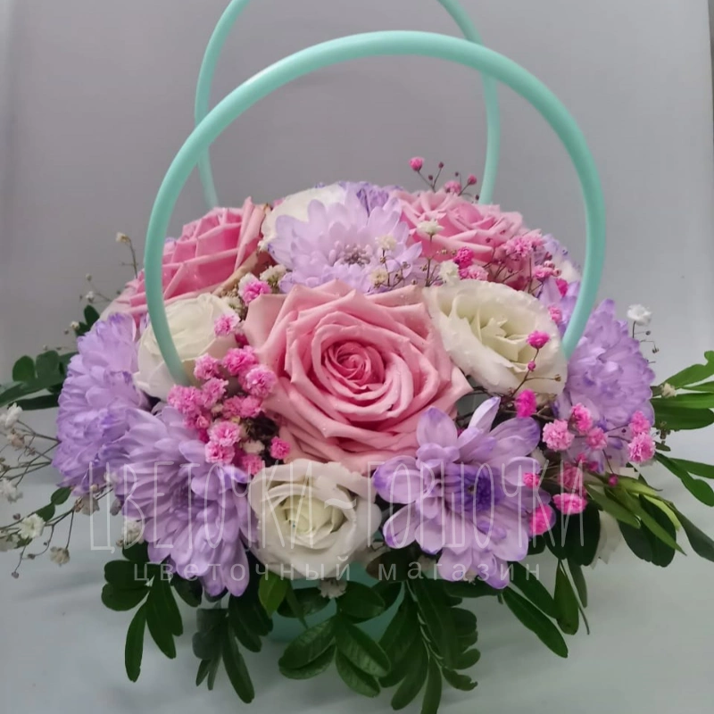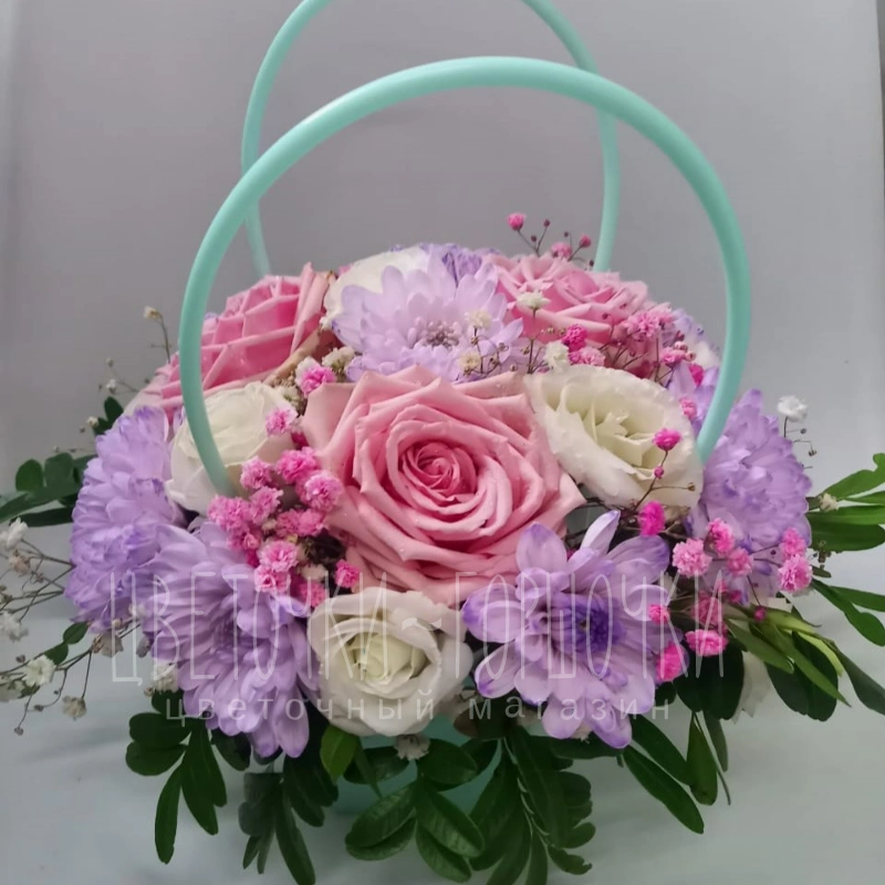 Нежная и элегантная сумочка в деликатной цветовой гамме. Композиция из роз, хризантем и других цветов дополнена воздушной зеленью и стильной ручкой, придавая композиции завершенный и оригинальный вид. Эта композиция станет прекрасным подарком для любого случая.