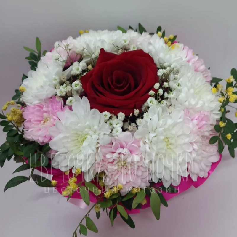 Эта композиция - нежное сочетание красных роз, белых и розовых хризантем, дополненное изящной гипсофилой и листьями зелени. Композиция создает трогательный и элегантный образ, идеально подходящий для выражения глубоких чувств и любви. Маленькая композиция станет прекрасным подарком для самых дорогих людей.