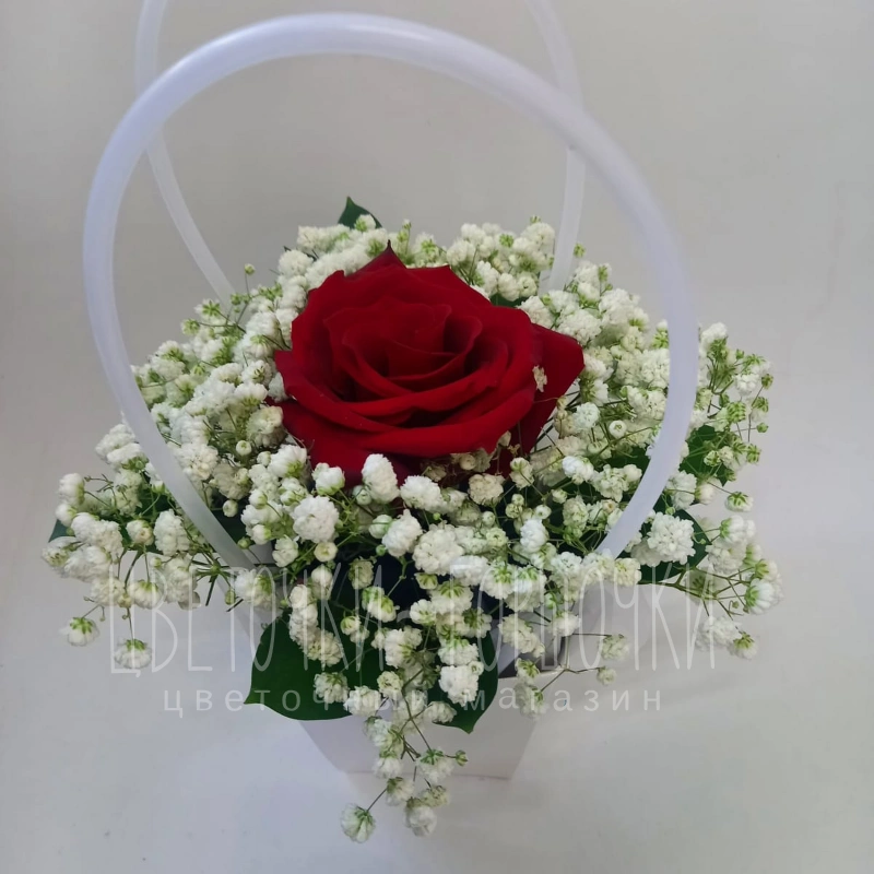 Букет представляет собой элегантную композицию, в центре которой находится роскошная красная роза, окруженная нежными облаками гипсофилы. Длинная белая лента, красиво изогнутая над букетом, добавляет ему воздушности и торжественности. Этот букет идеально подойдёт для выражения глубоких чувств и романтических признаний.