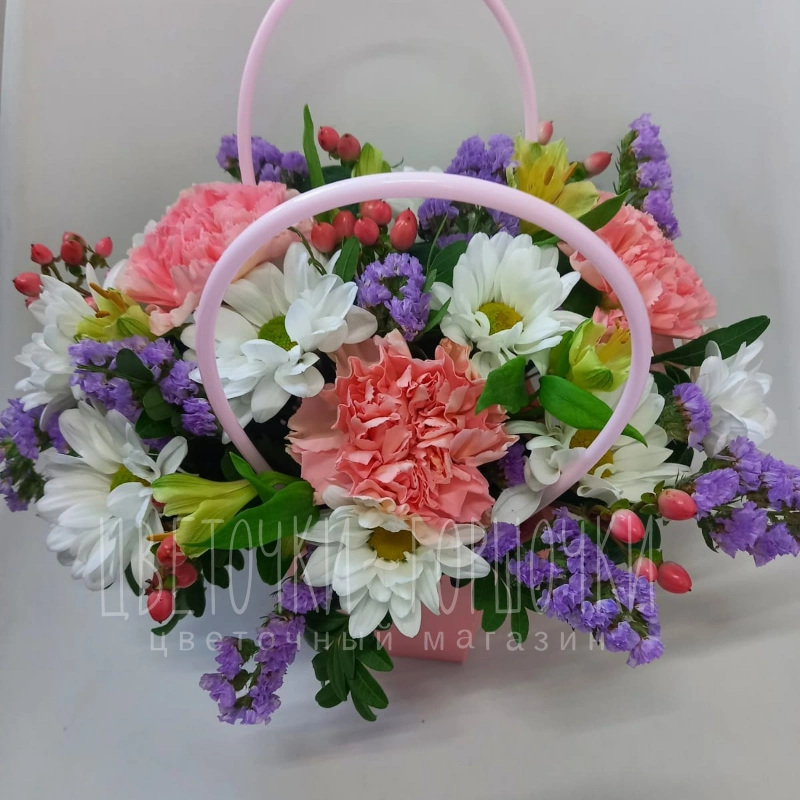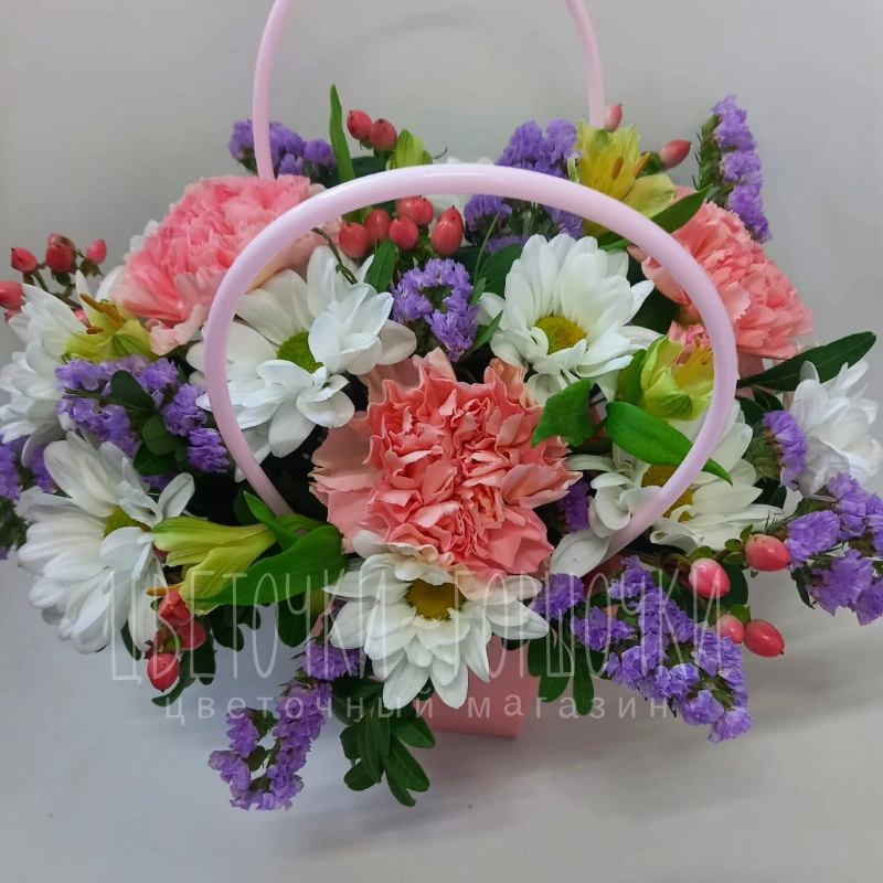 Нежная цветочная композиция в розовой корзине, украшенная ручкой в форме кольца, включает в себя гвоздики, ромашки и другие цветы, создавая трогательный образ. Букет с розовыми, белыми и фиолетовыми оттенками цветов воплощает женственность и элегантность, а корзина добавляет работе завершенность и гармоничность. Данный букет станет прекрасным подарком для ваших близких.