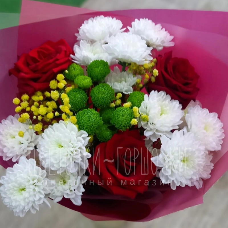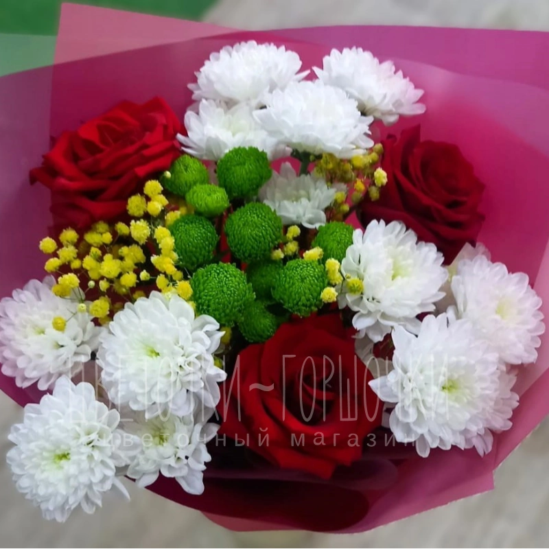 Букет из красных роз, белых хризантем и зелёных шаров хризантемы, дополненный желтой танжерии, создает яркий и элегантный образ. Сочетание бархатистых роз и воздушной танжерии с нежными хризантемами выглядит стильно и выразительно. Этот букет идеально подойдёт для подарка или как способ выразить эмоции.