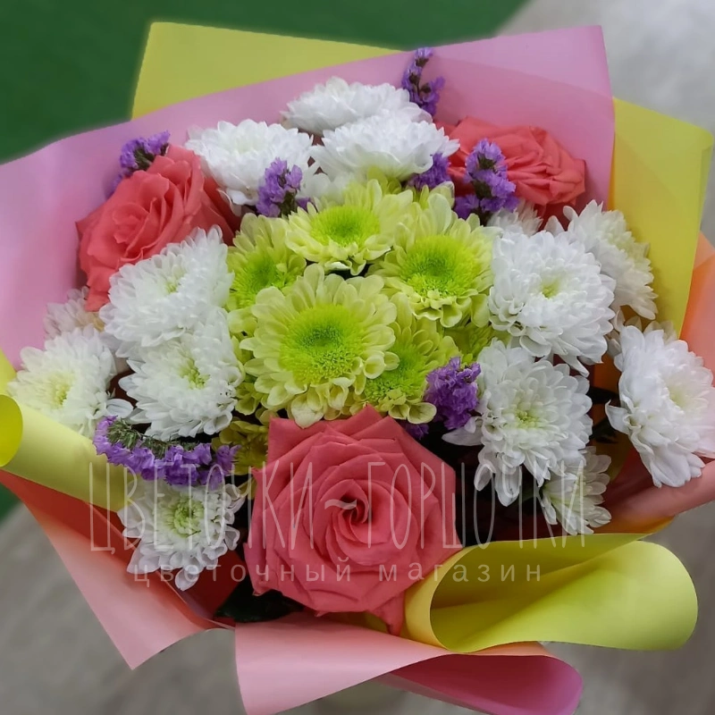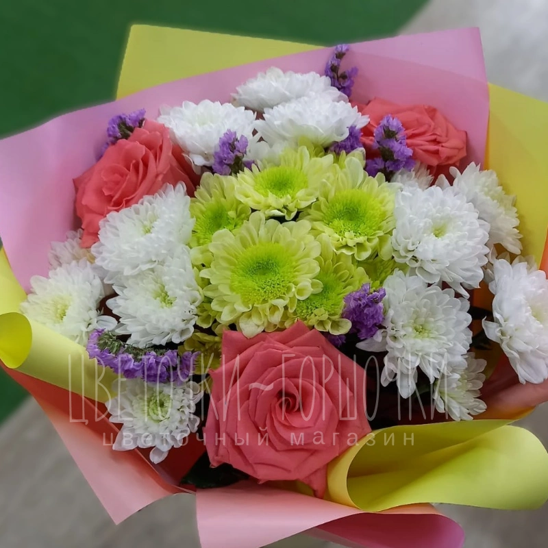 Букет, сочетающий в себе розовые розы, белые хризантемы и желтые хризантемы, создает яркий и нежный образ. Дополненный фиолетовыми акцентами, он выглядит свежо и празднично. Этот букет идеально подходит для выражения теплых чувств и радости.