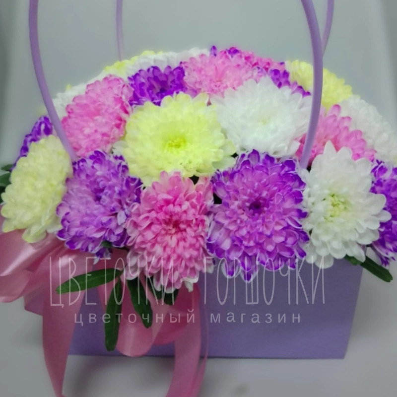 Букет из свежих хризантем в нежных оттенках розового, фиолетового и белого цвета станет прекрасным подарком для близких и друзей. Пышные цветы в корзинке, украшенной атласной лентой, излучают тепло и создают праздничное настроение. Композиция станет отличным выбором для любого торжества