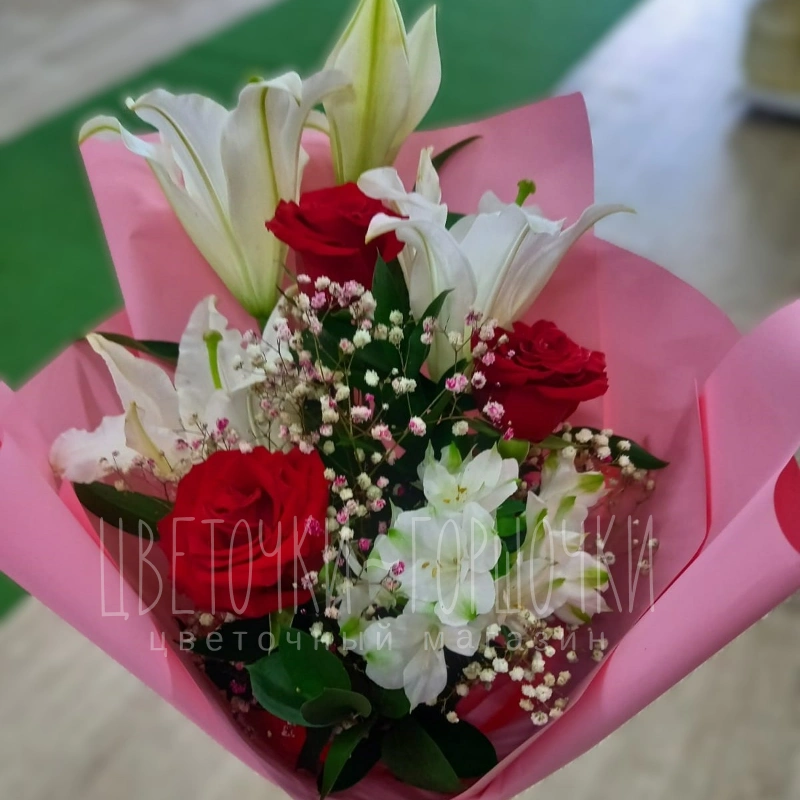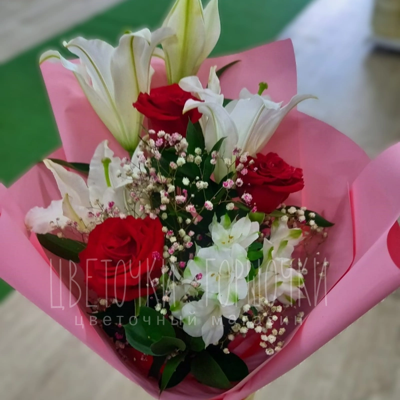 Букет, представленный на изображении, отличается элегантностью и гармоничным сочетанием цветов. Композиция включает в себя три алые розы, белые лилии и гипсофилу, создавая ощущение воздушности и легкости. Ниже представлено возможное описание букета для каталога: Сдержанный и элегантный букет, в котором классические красные розы дополнены белоснежными лилиями и изящной гипсофилой, создает атмосферу благородной простоты, идеально подходящую для любого торжества. Нежные оттенки и воздушная структура цветов делают композицию выразительной и запоминающейся. Этот букет станет прекрасным подарком, наполненным искренними чувствами.