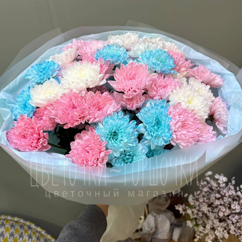 Букет из пышных хризантем в голубых, розовых и белых оттенках создаст воздушную и романтичную атмосферу, идеально подходящую для нежного и трогательного подарка. Этот букет вдохновляет легкостью и чистотой, делая его прекрасным выражением любви и заботы. Хризантемы символизируют долголетие и верность, добавляя букету особую глубину и смысл.