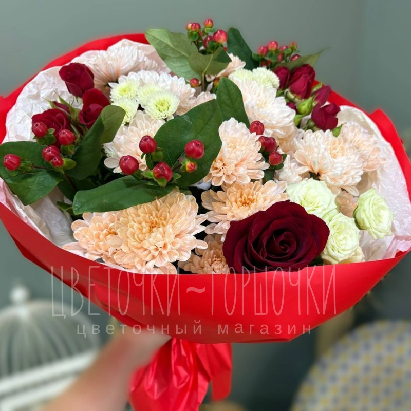Букет из роз, георгин и ягод добавляет тепло и уют в любое пространство. Нежные оттенки цветов гармонично сочетаются с яркими акцентами, создавая выразительную композицию. Этот букет станет прекрасным подарком для близких или украсит ваш интерьер.